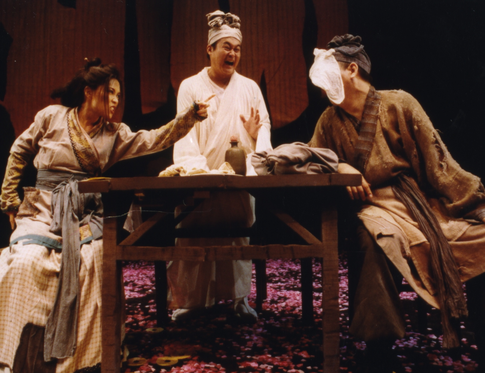 Secret Love for the Peach Blossom Land, the Performance Workshop’s second work, was an immediate critical and popular success. Two theatre groups are mistakenly booked into the same theatre for a dress rehearsal. One is to perform a melancholy contemporary play ”Secret Love,” about an elderly Taipei man’s yearning for his first love in Shanghai before the communist takeover. The other is rehearsing a farcical period costume ”Peach Blossom Spring,” based on the classic Chinese Utopian text “A Record of the Peach Blossom Spring.” As the two groups struggle for control of the stage, the two plays unfold in fragments. Slowly the tragic and comic, the contemporary and the classical, begin to interact, and seemingly opposite themes and performance styles blend to form new meanings, particularly in reference to Taiwan's attitudes toward the Chinese mainland, and the universal yearning for a “Peach Blossom Land.”.